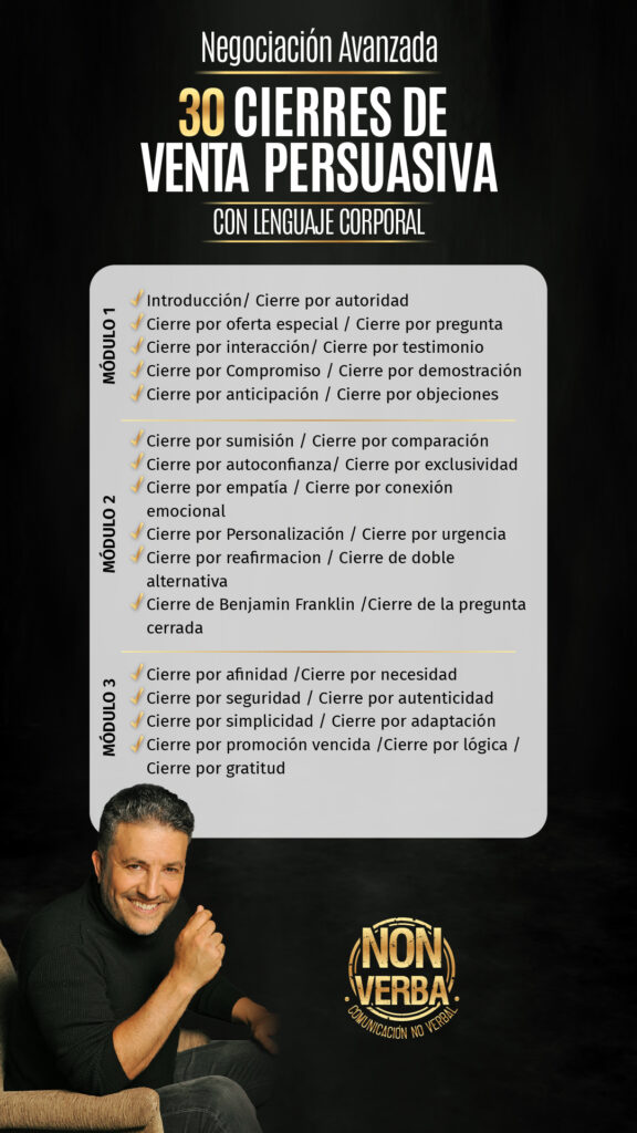Tuviste una reunión estratégica, ordenada y planificada, en los primeros momentos de la negociación aplicaste las técnicas oportunamente, todo indicaba que lograrias tu objetivo, pero justo al final se cae la negociación, perdiendo el tiempo y esfuerzo invertidos ¿Te ha pasado?. Hugo Lescano trae este innovador y novedoso entrenamiento con 30 cierres de venta persuasiva con lenguaje Corporal explicados magistralmente de forma práctica y sencilla. Hugo Lescano volcó en este programa toda su experiencia como negociador en escenarios carcelarios por más de diez años en las cárceles de Buenos Aires. Este entrenamiento combina su experiencia con las técnicas más exitosas de la negociación como nunca nadie te lo explicó y herramientas de comunicación persuasiva aplicadas a las ventas y a todo tipo de negociaciones de la vida cotidiana.